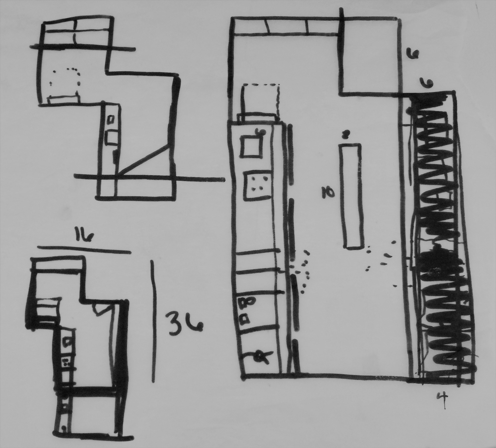I am still very interested in an "apartment in a box" idea. I was very influenced by minimalism at this time but I am still curious about affordable pre-fab housing, and I wonder if this could lead to some solutions. The small kitchen, bathroom, and Murphy bed are all contained within the service rectangle.
